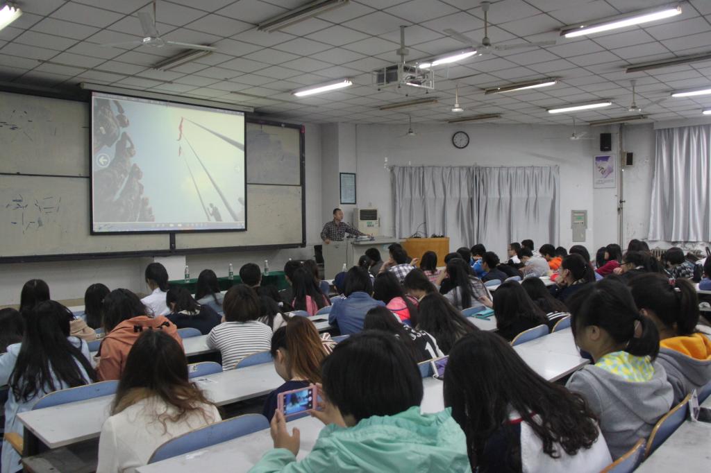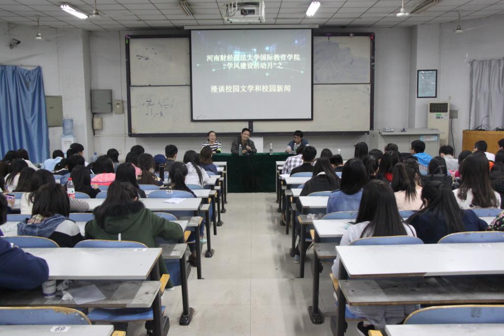 2015年4月20日晚7点,我院学风建设活动月系列活动——“校园新闻与摄影”讲座在我校文北校区十阶一教室举行,《河南青年报》摄影记者徐宗福、青年作家宗隆隆、新华网记者杨岗喻走进校园与我院学生开展了一场别开生面的报告会。