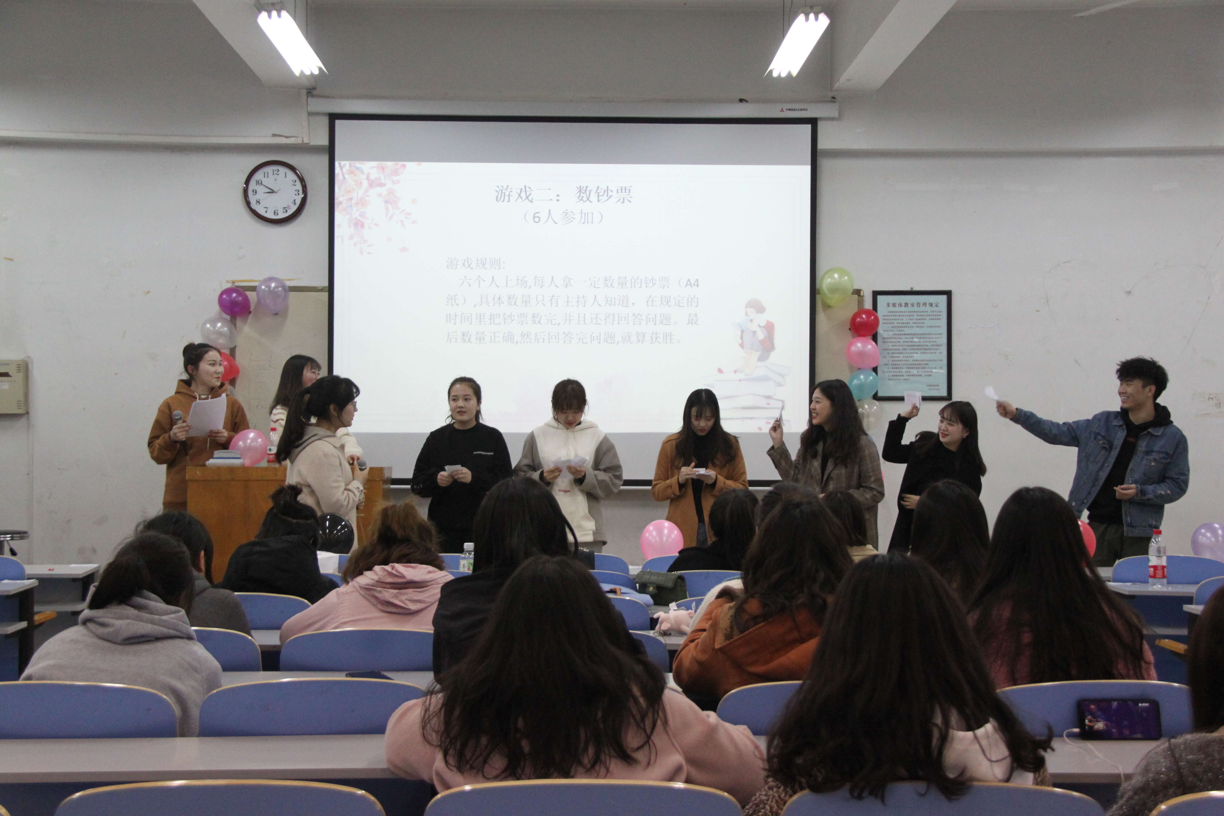 活动开始,张一放同学演唱歌曲《告白气球》,拉开了本次活动的序幕。接下来是多个游戏环节,包括“心愿盒子”、“踩气球”、“数钞票”等等,许多女同学踊跃参加,现场气氛十分活跃。