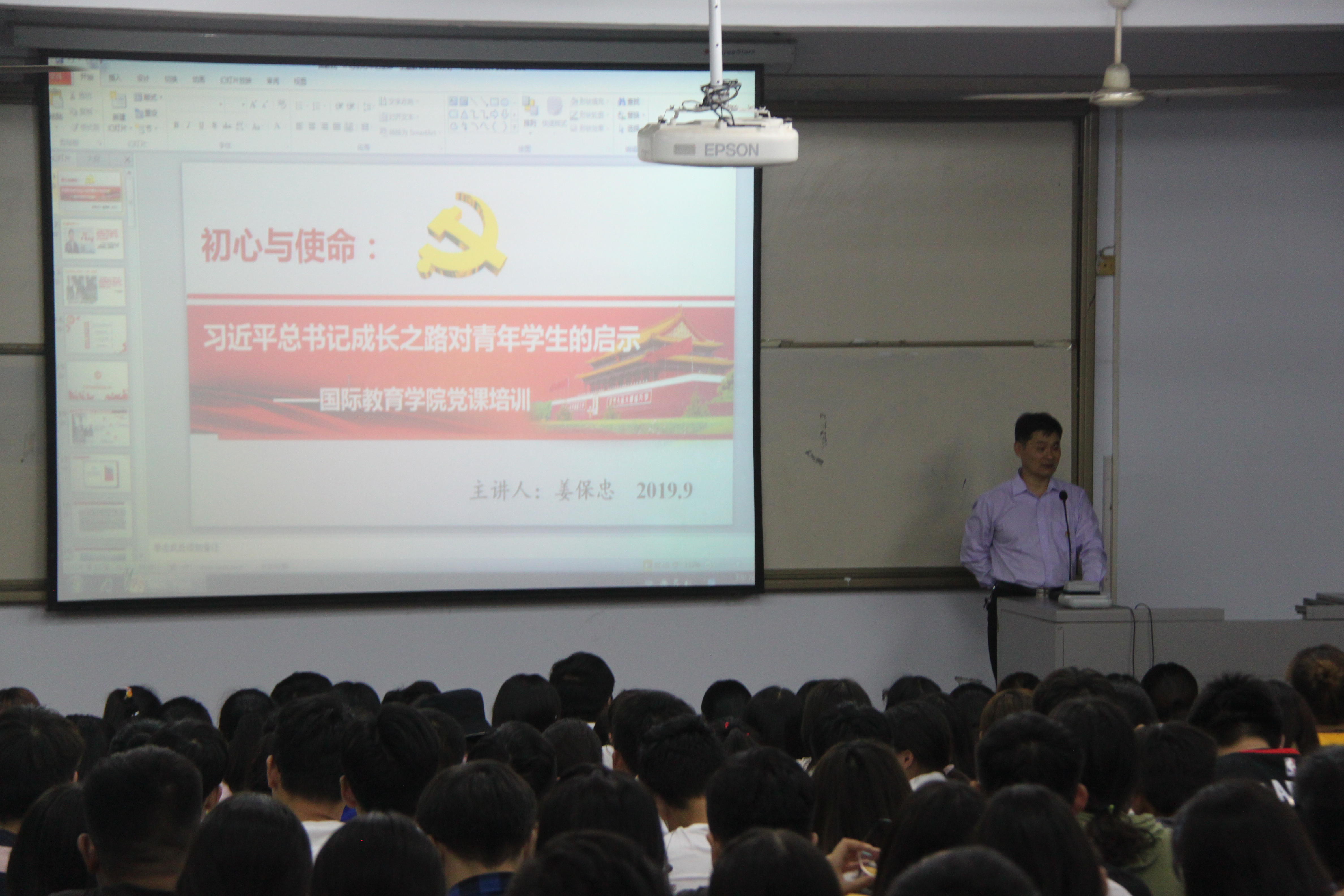 WilliamHill学生党支部于2019年9月27日晚19:00在文北校区二东一教室举办“不忘初心、牢记使命”主题党日活动。活动邀请院党委副书记姜保忠作专题党课,党校第十八期入党积极分子培训班学员及2019级新生代表等近300人聆听了本次党课。