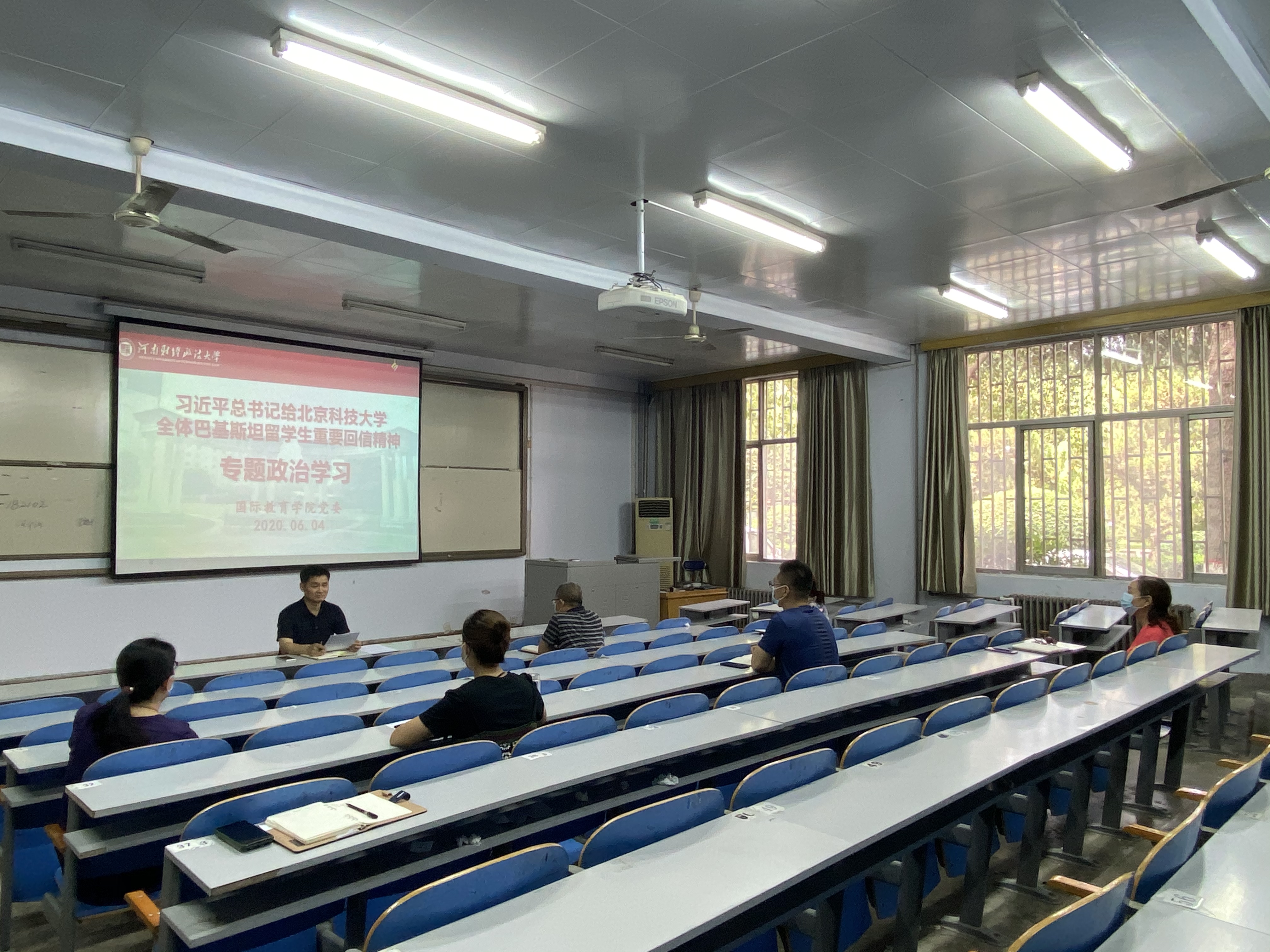 为深入学习贯彻习近平总书记给北京科技大学全体巴基斯坦留学生重要回信精神,WilliamHill党委于2020年6月4日15:00在文北校区二号楼东一合堂教室组织专题政治学习。会议由WilliamHill党委书记姜保忠主持,学院领导班子成员及教师参加了本次会议。