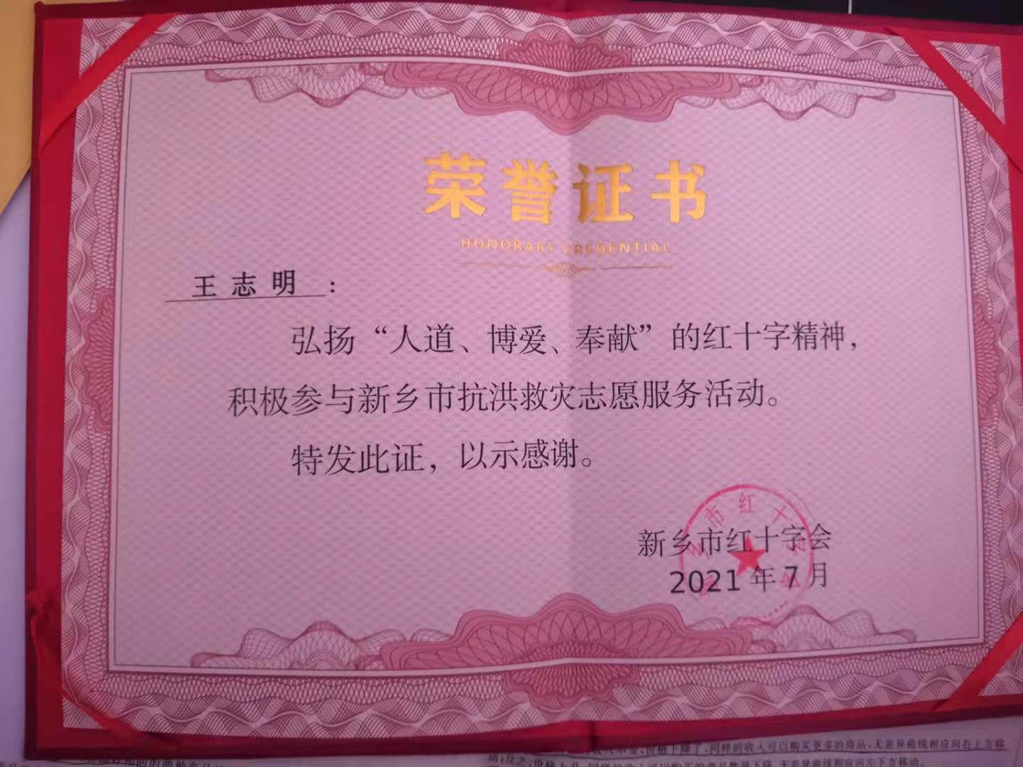 据悉,在新乡市人民抗击“7.20”洪灾的过程中,王志明在力所能及参与募捐、捐赠爱心救灾物资之余,第一时间投身紧张忙碌的就在工作,先后转战新乡市平原(建业)体育汇总新救灾物资接收站,凤泉区、卫辉市抗洪前线开展了物资接收及发放、救灾救援、排查洪水中受伤人员等工作,累计志愿服务时长达90小时,用实际行动诠释了新时代中国青年的勇敢与坚强、责任与担当,弘扬了“人道、博爱、奉献”的红十字精神和“奉献、友爱、互助、进步”的志愿服务精神。