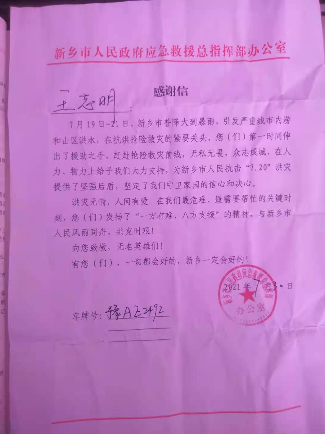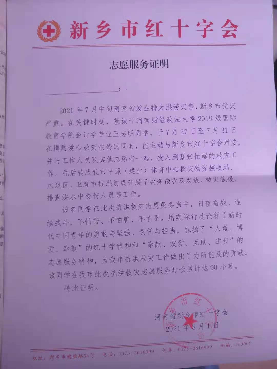 我院学生王志明收到防汛救灾志愿服务感谢信