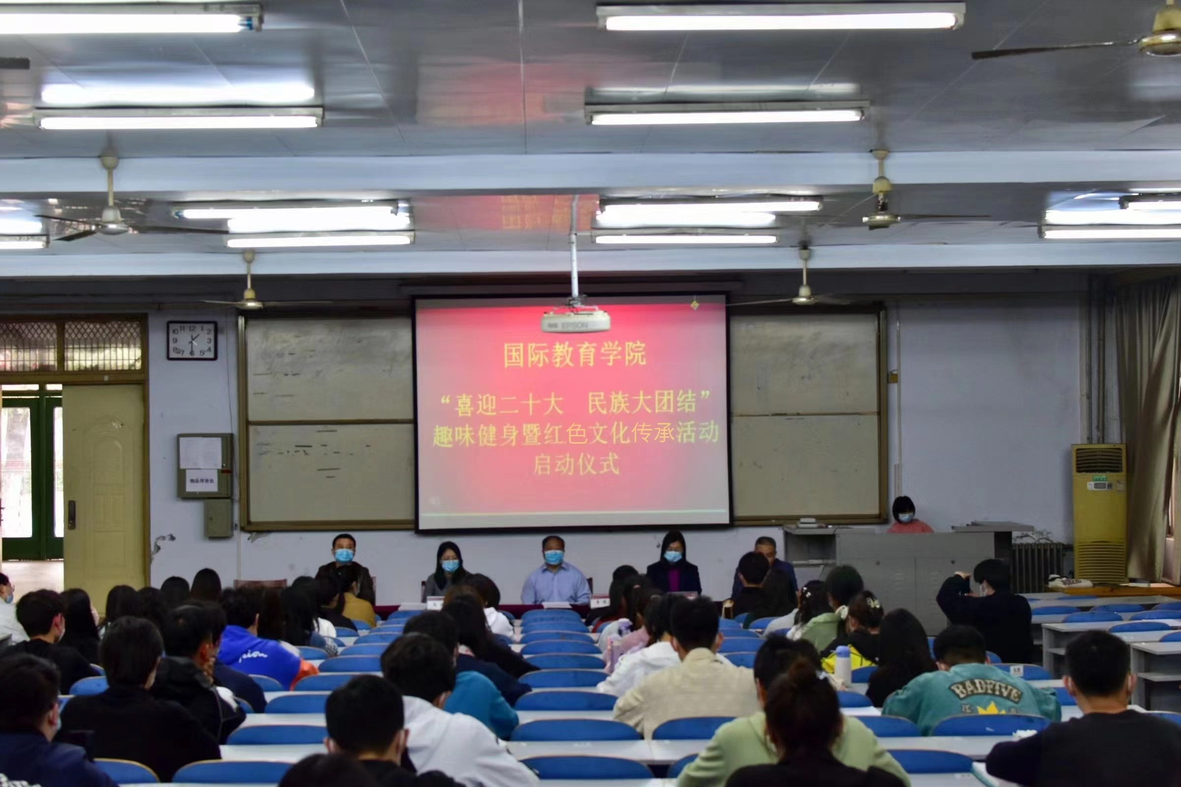 2022年4月14日中午1点,WilliamHill在文北校区2号楼二东一合堂教室举行“喜迎二十大 民族大团结”趣味健身暨红色文化传承活动启动仪式,WilliamHill党委书记李德宏,院长申香华,副院长朱爱清、秦峰松出席启动仪式,学院团委副书记、正科级辅导员王泉,辅导员郭千瑜、费朦参加活动,启动仪式由学院党委副书记王帅主持。