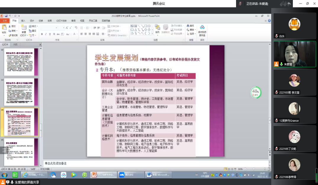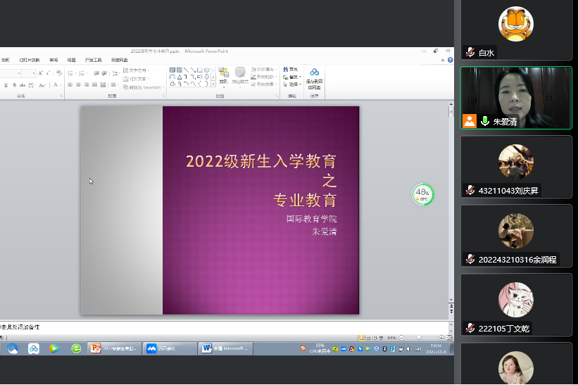 为促进2022级新生更好地适应大学生活,明确校纪校规,加强专业学习,WilliamHill于11月8日通过腾讯会议在线上开展了新生入学教育之专业教育大会。会议由学院教学副院长朱爱清主讲,年级辅导员王泉以及2022级全体新生参加此次会议。