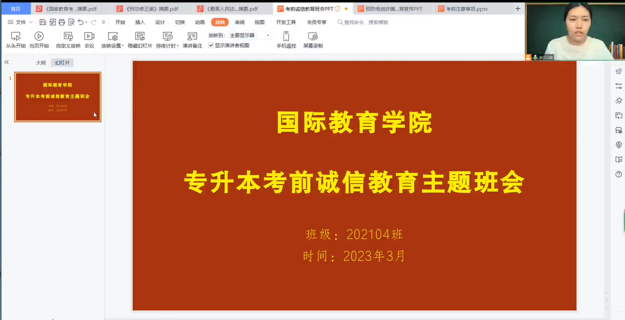 为切实做好2023年专升本考试相关工作,提升我院专升本考生的诚信意识,同时做好考生的思想政治教育和心理疏导。我院2023届毕业班辅导员费朦于3月14日至3月17日组织各班开展诚信教育主题班会。