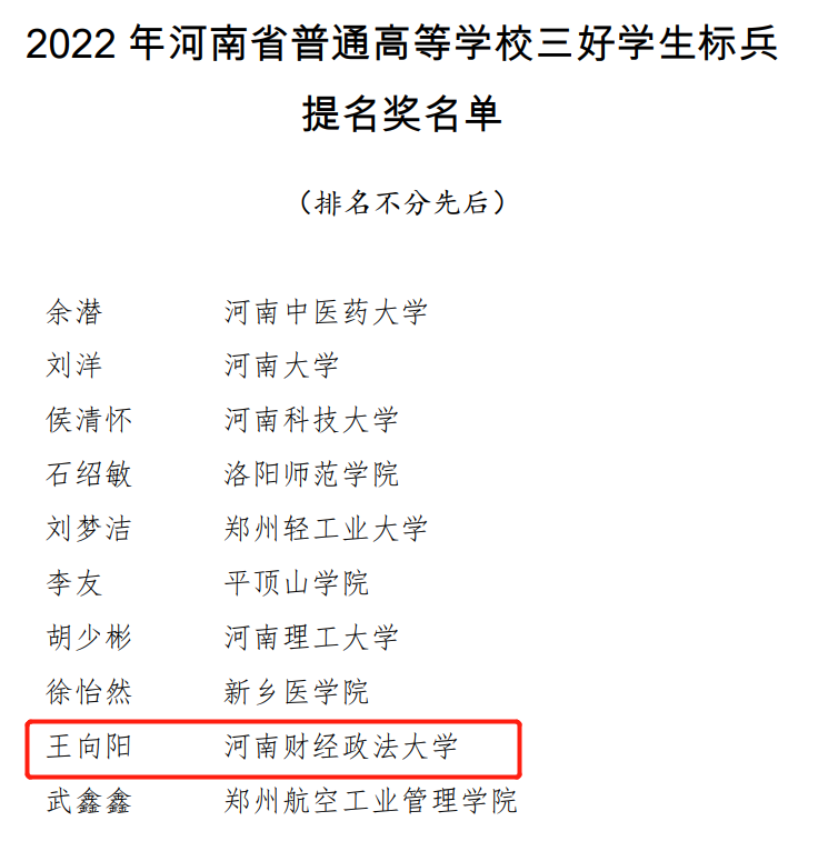 王向阳,中共党员,在校期间入伍。入伍期间综合表现良好,获得优秀义务兵和优秀学兵嘉奖。在校期间,综合成绩班级排名第一,专业排名第一,获得校一等奖学金、文明风尚奖学金、国家励志奖学金;曾任宣传部新闻中心主任,荣获校优秀学生干部、优秀教官、优秀团干、三好学生标兵、河南省优秀毕业生、河南省三好学生、河南省文明学生、河南省三好学生标兵提名等荣誉。