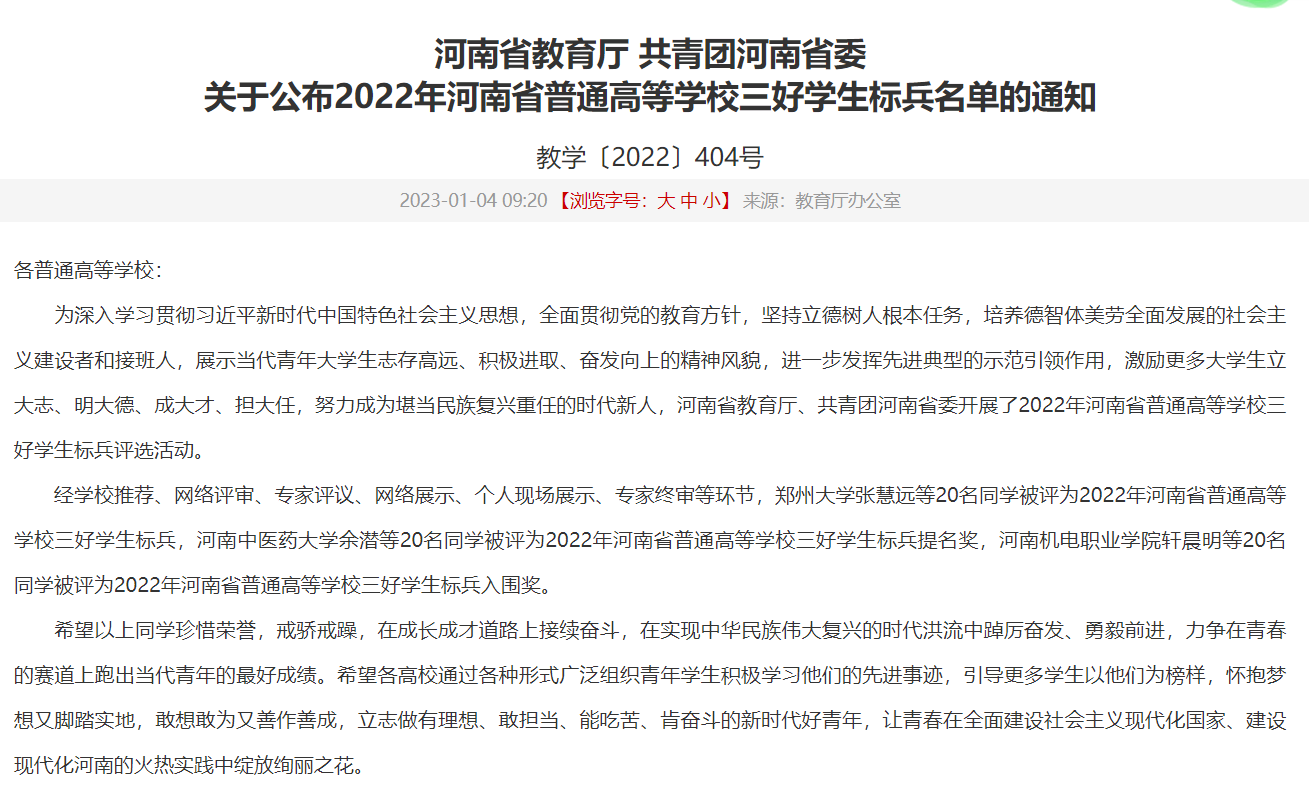据悉,本次宣讲报告会由河南省教育厅、共青团河南省委在2022年河南省三好学生评选的基础上,开展的首届河南省三好学生标兵评选活动。经学校推荐、网络评审、个人展示和专家终审等环节,共评选出20名三好学生标兵奖、20名三好学生标兵提名奖和20名三好学生标兵入围奖。