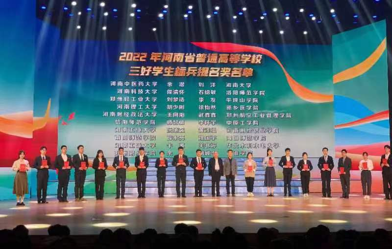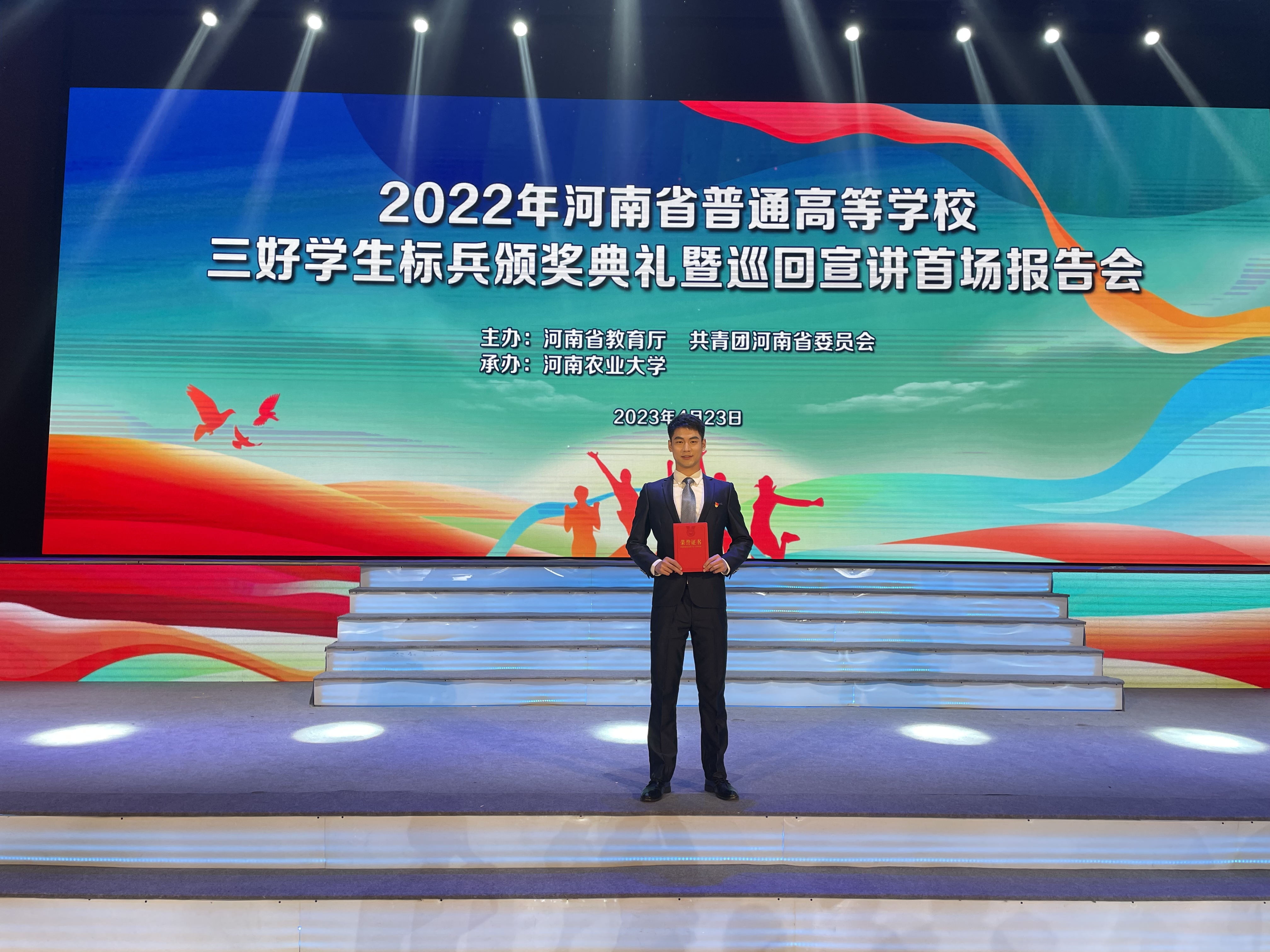 为充分展示当代青年大学生志存高远、积极进取、奋发向上的精神风貌,发挥先进典型的示范引领作用,4月23日下午,由河南省教育厅、共青团河南省委主办,河南农业大学承办的2022年河南省普通高等学校三好学生标兵颁奖典礼暨巡回宣讲首场报告会在河南农业大学龙子湖校区举行,我院优秀学子王向阳作为2022年河南省三好学生标兵提名奖获得者参加宣讲会。