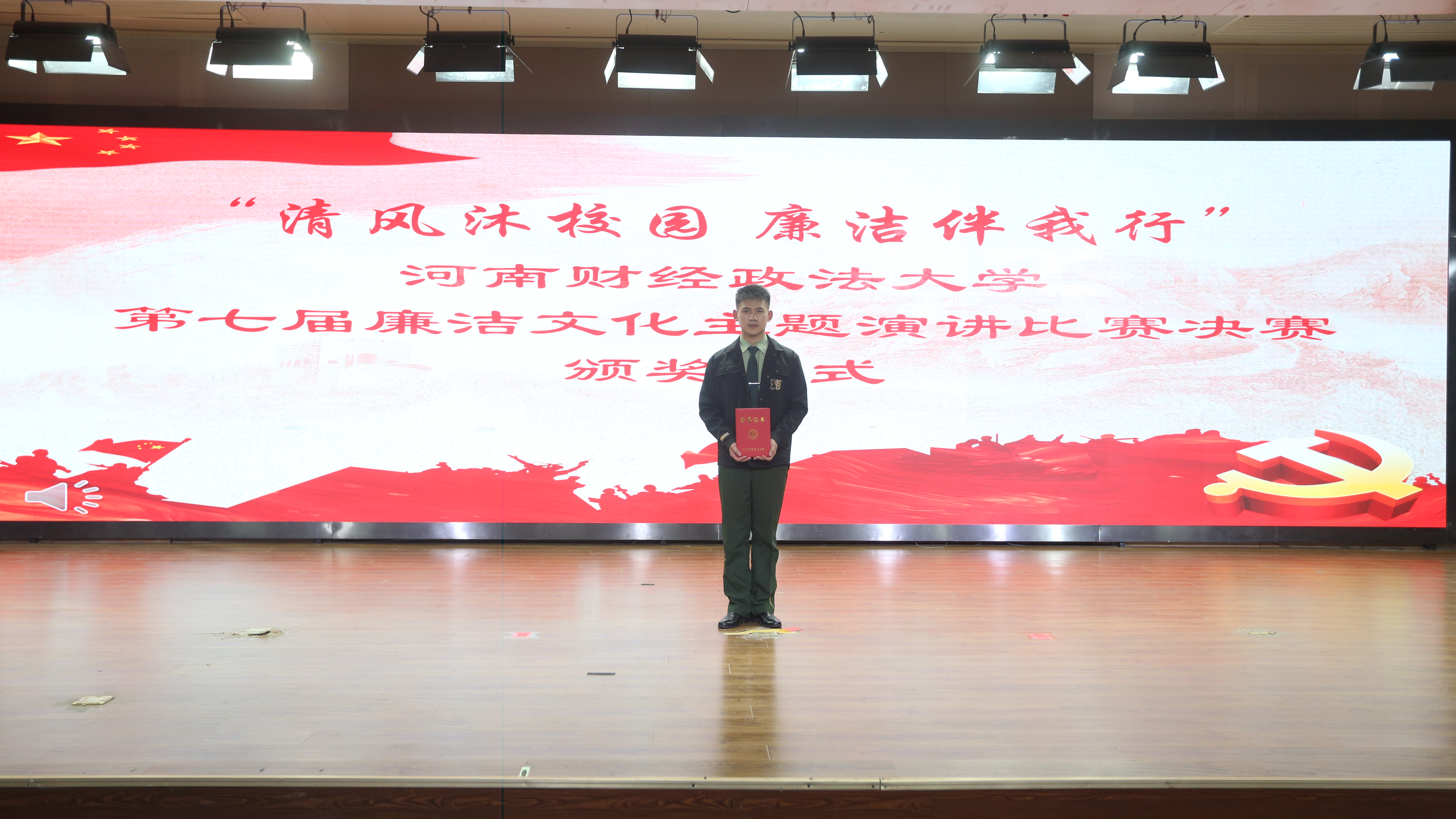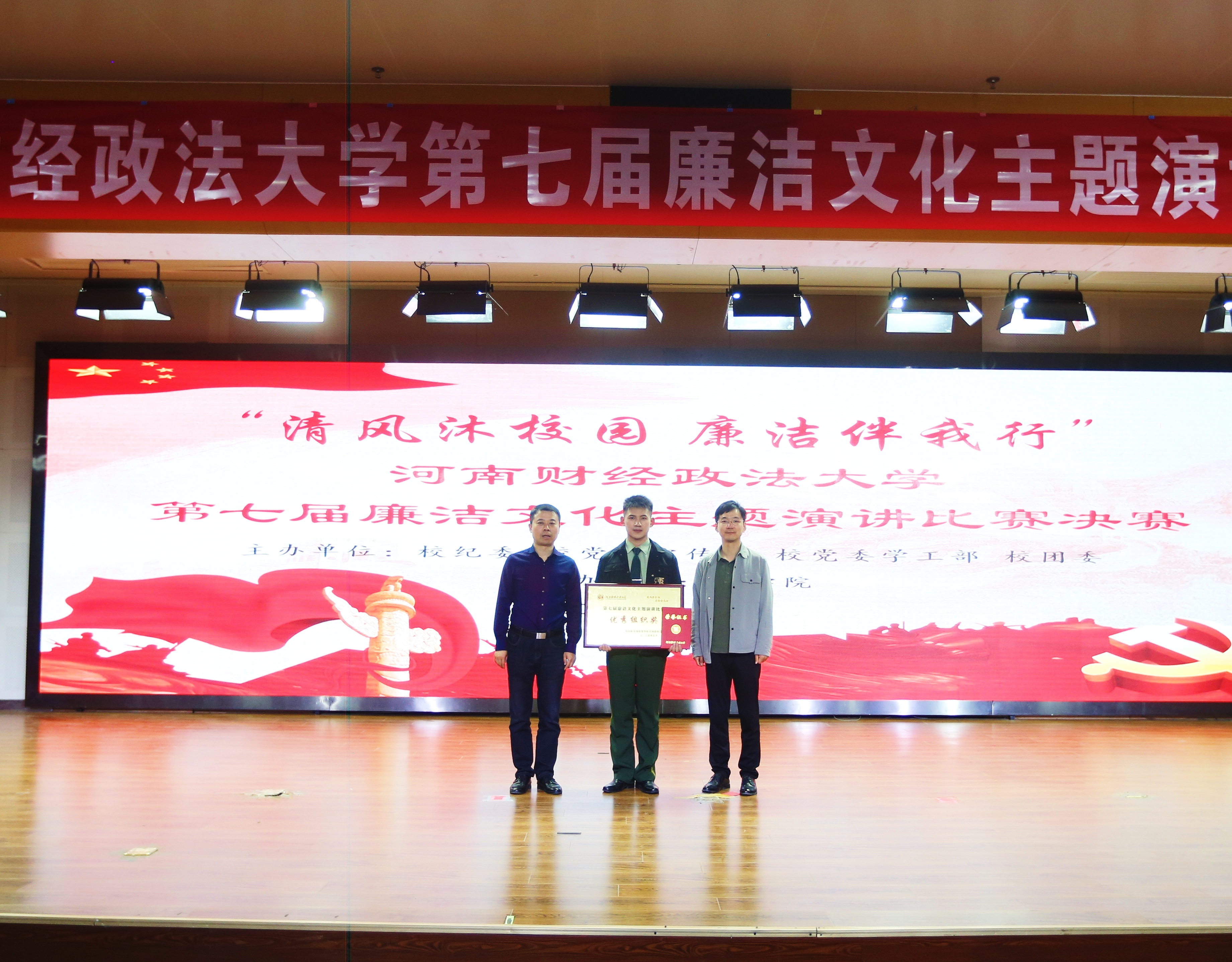 5月9日晚,由校纪委、党委宣传部、党委学生工作部、校团委联合主办,法学院承办的第七届廉洁文化演讲比赛决赛在郑东校区举行。我院学子刘庆晟经过学院初赛、学校复赛,最终在决赛中代表学院取得学校三等奖的好成绩,学院获“优秀组织奖”。