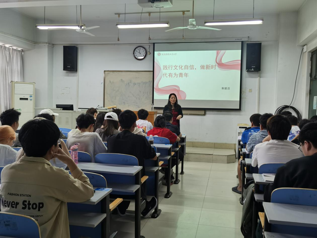 5月8日,我院朱爱清副院长给2023级的学生上了题为“践行文化自信,做新时代有为青年”的专题思政课。朱爱清副院长以习近平总书记提出的“四个自信”为出发点,重点讲述了文化自信的内涵,以及如何才能做到文化自信。她对参加讲座的学生提出了要求,鼓励他们要努力学习,传承和创新中国文化,要做中国文化的使者,向世界讲好中国故事。
