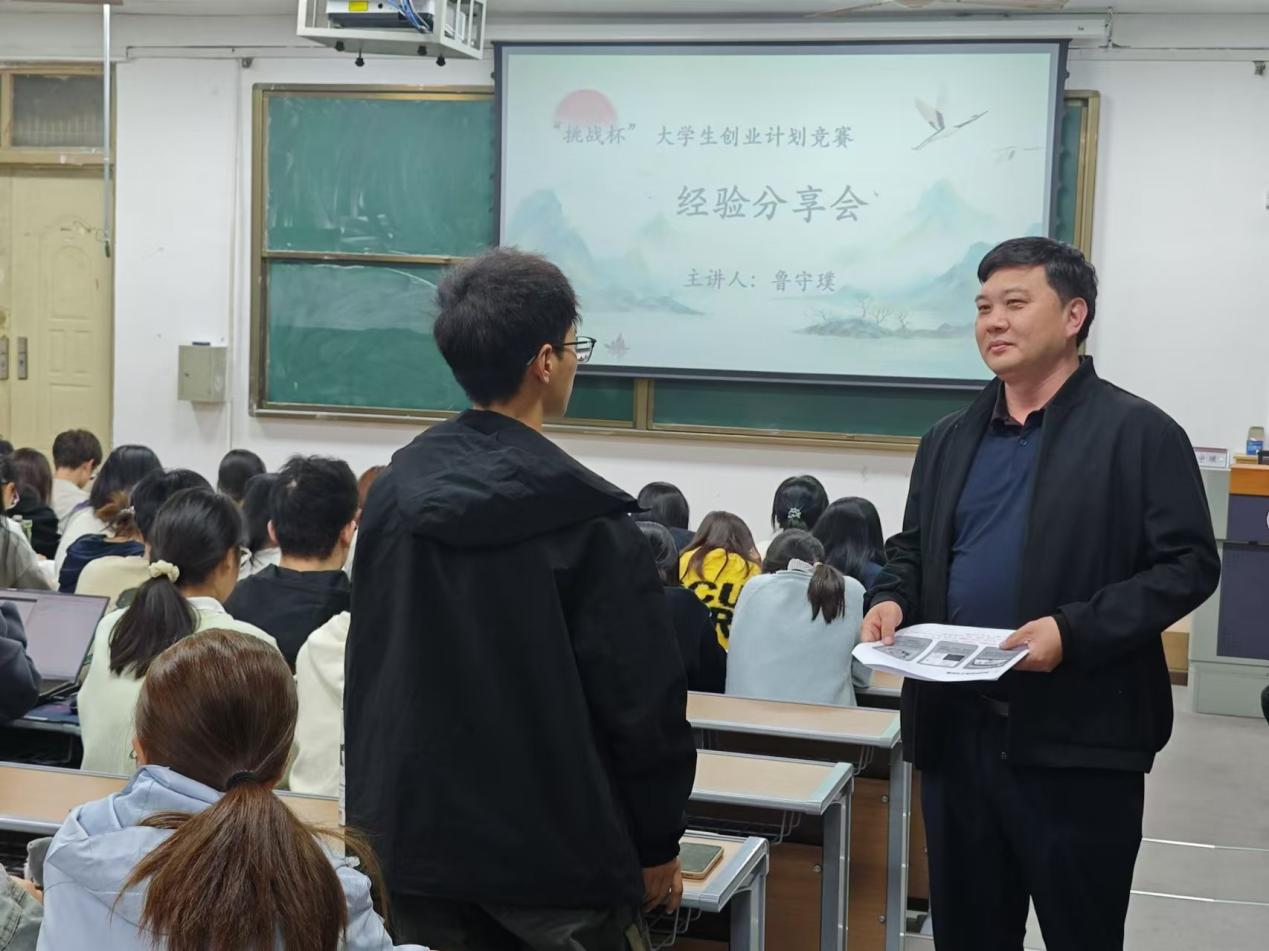 鲁守璞从参加各类学科竞赛的意义和重要性入手,给同学们讲解了“挑战杯”的知识,介绍了各个时间节点和注意事项,分享了自己的指导比赛经验,涉及选题、策划书撰写、答辩等环节,重点讲述了项目的创新型、应用性和可行性,鼓励同学们结合专业知识和个人兴趣爱好,积极参加赛事并取得好成绩。