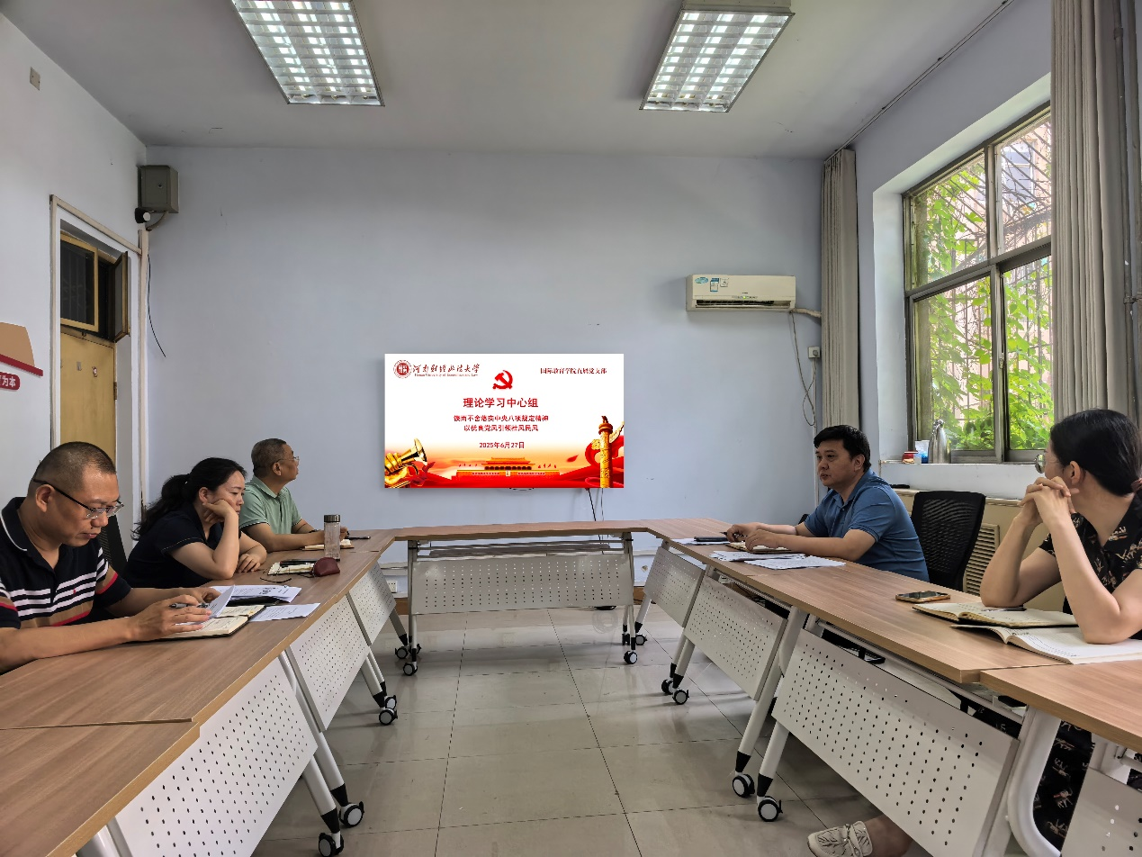为进一步贯彻落实中央八项规定精神,6月27日,学院直属党支部书记鲁守璞主持召开党支部理论学习中心组(扩大)集体学习会议,专题学习贯彻落实中央八项规定精神。学院党政班子成员及科级以上干部参会学习。