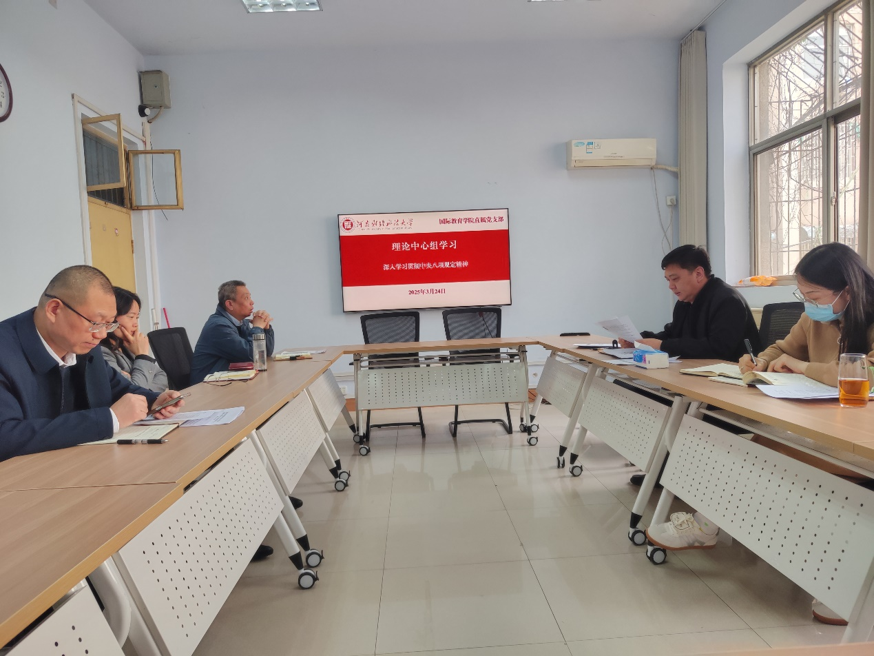 为深入推进全面从严治党,3月24日,学院直属党支部书记鲁守璞主持召开党支部理论学习中心组集体学习会议,专题学习中央八项规定精神。学院直属党支部理论学习中心组成员参加。