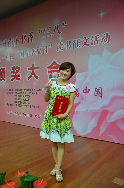 2013年7月13日,“全国首届书香‘三八’——幸福中国·喜迎‘国际幸福日’读书征文活动”颁奖大会在中国现代文学馆隆重举行。我院教工张晓静的《这一刻,我看到了幸福》荣获本次征文比赛的优秀奖。人民网、中国新闻出版网、中工网、求是理论网、腾讯网等多家媒体对本次颁奖大会进行了报道。